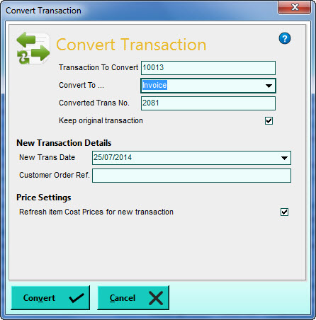 This option is used to convert sales transactions such as quotations, estimates, proformas and sales orders*** into invoices or other types of transactions. For example if you have entered an estimate that you now want to convert into a full invoice. ***The Convert option is important when converting sales orders into invoices to make use of the sales order stock allocation tracking facilities to despatch stock that was allocated to a sales order.