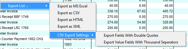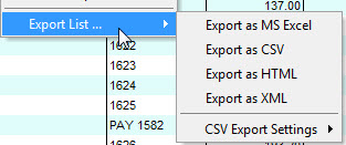 To export a data list, right-click on the list, select Export List ... from the menu and select the relevant format that you want to export the data in from the sub-menu.