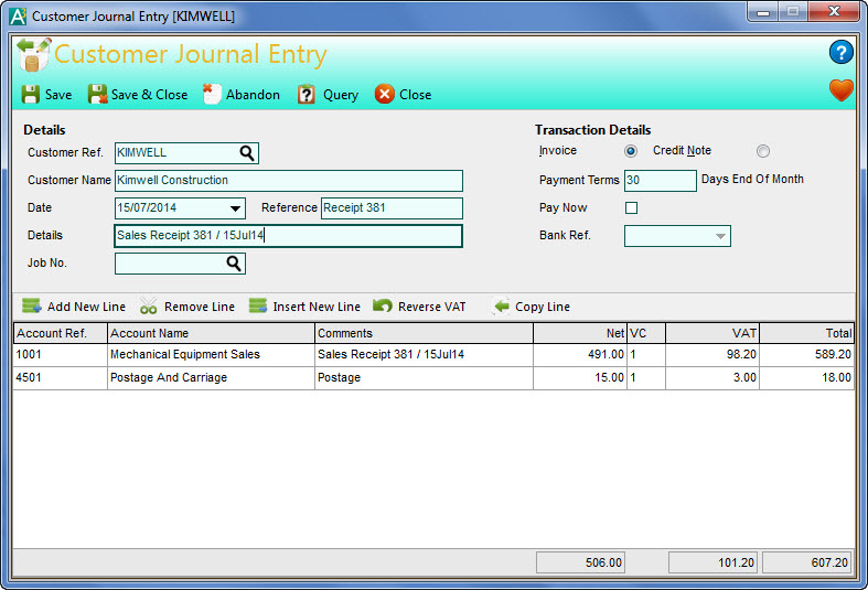 Click the Reverse VAT button to calculate the VAT inclusive of a value entered into the Net column on the selected entry line. This will then place the resulting values in the Net and VAT columns.