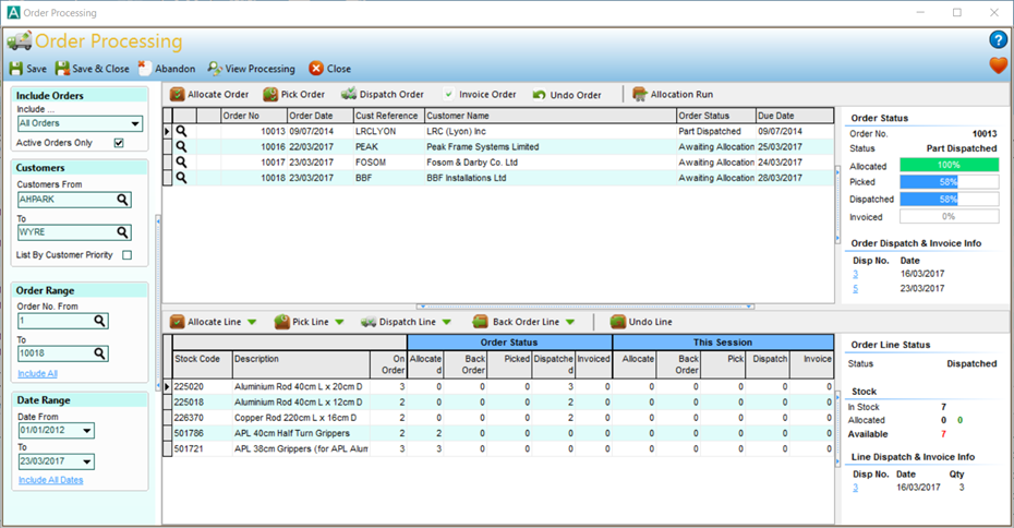 The Order Processing window enables you to define a list of orders you want to work with. Once the list of orders is selected you can process several orders in a session before you need to save the changes.