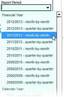 The Report Period drop-down box can be used to select a range of periods automatically rather than having to select each period individually. For example if you want to view each of the periods in a specific financial year. Click the down-arrow button (or press Alt+DownArrow on your keyboard) to view the options available. The options at the top of the list will use your financial calendar. Select the month-by-month options to select each month or period in the selected financial year and the balances for each month will be displayed in individual columns. Select the quarter-by-quarter option for the relevant financial year for balances for the four quarters in the selected financial year to be displayed in individual columns. You also have the option to select periods automatically based on the calendar year.