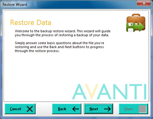 On this page you are asked to specify the backup file you want to restore. Click the folder button to the right of the prompt box to browse and locate the backup file. The browse window only includes Avanti backup files that have the extension .avb. When you select to browse to locate the backup file that you want to restore, the default location will be the folder where you last saved a backup file to. Once located, select the backup file and click Open. The full path and file name of the selected backup file will be displayed. Click Next to proceed.